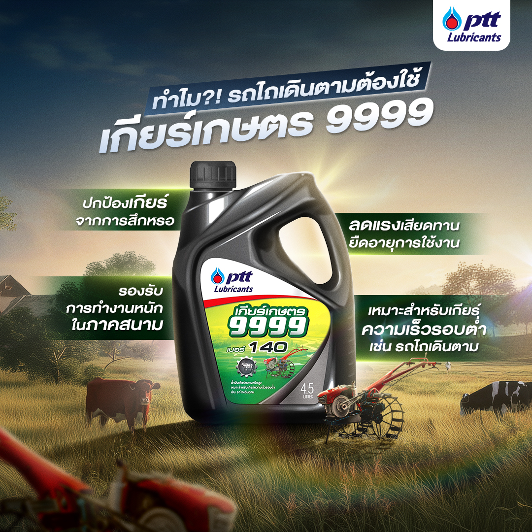 วันนี้ PTT Lubricants ขอพามารู้จักกับ "เกียร์เกษตร 9999" น้ำมันหล่อลื่นที่ออกแบบมาสำหรับเกียร์ความเร็วรอบต่ำโดยเฉพาะ เช่น เกียร์รถไถเดินตาม หรือเครื่องจักรกลทางการเกษตรที่ต้องเผชิญกับแรงโหลดสูงเป็นเวลานาน